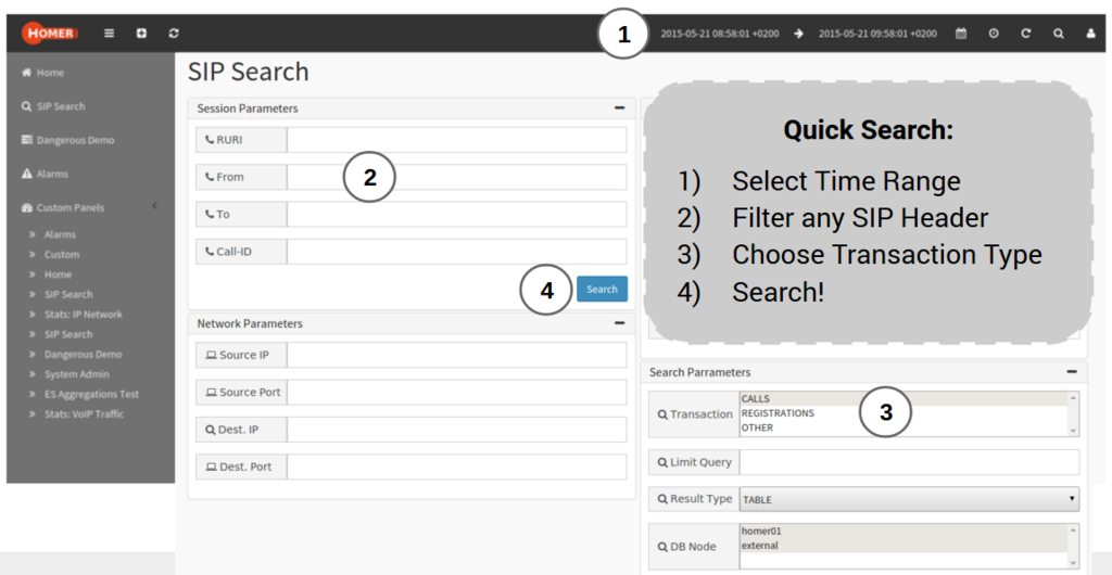 El buscador SIP del Homer Web UI permite hacer búsquedas precisas usando criterios como encabezados SIP tales como From:, To:, Call-ID: RURI: y otros parámetros tales como IP o puerto de origen y destino. Es posible filtrar transacciones que corresponden a llamadas o a peticiones de SIP REGISTER. Homer brinda amplios parámetros para la búsqueda en rangos de tiempo.